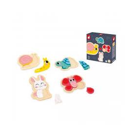 19,99 €¡A partir de 18 meses los niños pueden empezar a disfrutar de los puzles! ¡Son perfectos para desarrollar la motricidad fina y la coordinación! Con este lote de 4 puzzles evolutivos de primera infancia, ¡los pequeños fans de la naturaleza y los animales del jardín estarán encantados! Este juego de puzles de madera, que viene en una bonita caja de regalo, consta de cuatro puzles que van de 2 a 5 piezas para que los niños se diviertan y progresen a su ritmo. Están los animales favoritos de los más pequeñitos: un caracol de 2 piezas, una tortuga de 3 piezas, un conejo de 4 piezas y una mariposa de 5 piezas. Las piezas, que hay que posicionar en su sitio en un soporte de madera, son lo bastante grandes como para que el bebé pueda agarrarlas bien. ¡Disfrutará un montón jugando con este juguete de estímulo! Además, con este juguete también podrá empezar a aprender los números. Puzles de madera FSC®.