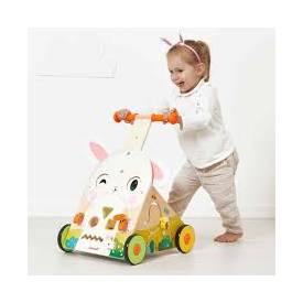 69,99 €Este carrito multiactividades de madera es perfecto para niños a partir de 1 año, ¡con un montón de pequeños juegos en los 3 lados! Se trata de divertirse y desarrollar la motricidad fina y la destreza con las 9 divertidas actividades de nuestro travieso conejo: circuito en bucle con sus zanahorias, caja de formas tradicionales y ratoncito para deslizarse por un laberinto en la parte delantera, laberinto de abejas en un lado, engranajes y sol sonoro en el otro. Los grandes ojos de nuestro conejo giran y sus mejillas son de fieltro, al igual que sus orejas, para desarrollar el sentido del tacto del niño. Un detalle divertido: las orejas son extraíbles con cierres de velcro, ¡para que puedas cambiarlas de posición a tu gusto! Este simpático carrito de actividades es especialmente adecuado para aprender a andar. Gracias a su asa regulable en altura (de 46 a 53 cm), se adapta a la estatura del niño. Puede utilizarse desde los 12 meses hasta los 3 años. Para mayor seguridad, dispone de un freno en las ruedas fácilmente regulable en 3 posiciones (bloqueo total, velocidad reducida, velocidad normal), para que puedas soltarlas progresivamente y controlar la velocidad del carrito a medida que tu hijo aprende. Un carrito de madera con freno es ideal.
