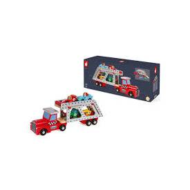 Un vehículo que transporta otros vehículos: siempre es impresionante para los pequeños ver este tipo de camiones en la carretera durante un viaje. ¡Este es uno más pequeño que hará las delicias de los fans de los coches y los bólidos de todo tipo! Con su rampa de fácil manejo, este camión de madera puede llevar dos coches de carreras en cada nivel, es decir, cuatro en total (1 Fórmula 1 rojo, 1 Speed azul, 1 Roadster verde y 1 Retromotor amarillo) que se pueden transportar en el camión o utilizar para jugar por separado. Para que la rampa se deslice hacia la parte trasera del camión y se abra la puerta, solo hay que tirar de las pequeñas asas rojas. ¡Este bonito camión hará las delicias de los amantes de los vehículos desbordantes de imaginación a partir de 2 años!