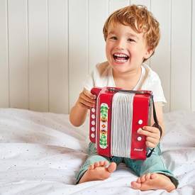 • MI PRIMER ACORDÉON: Con 7 teclas sonoras, 2 teclas para cambiar de tono y 1 botón para insuflar aire, este acordeón rojo fomenta el estímulo musical de los niños, que se divierten inventándose sus propias canciones populares y soñando con ser músicos.
