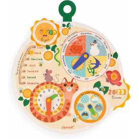 34,99 €¿A qué día estamos? ¿Por qué me tengo que poner un jersey hoy? ¡Cuántas preguntas para los pequeños, que aún no entienden bien el tiempo y las estaciones! Esta rueda del tiempo, un auténtico calendario infantil, es una herramienta pedagógica ideal para ayudar a los pequeños a partir de 3 años a entender mejor el paso del tiempo. Esta agenda de madera se cuelga fácilmente de la pared para que los niños puedan mirarla durante sus actividades de cada día. Se empieza por el año: se gira la ruedecita de la derecha para que aparezca la cifra en cuestión. Es muy práctica porque tiene dos caras, con lo que el niño puede utilizarla durante 10 años (5 por cada lado). Luego están las estaciones: en la esfera ilustrada los niños se fijan en las ilustraciones y señalan el mes acertado. Luego les toca el turno a los días de la semana: hay que desplazar el cursor de arriba a abajo y de lunes a domingo y luego se gira el sol para poner la fecha del día. ¡Qué fácil! Solo falta la previsión meteorológica: miramos por la ventana y ponemos la aguja en el dibujo que corresponda. ¡Es ideal para que los niños aprendan a vestirse solos! Y, si quieren ir un poco más lejos, pueden indicar incluso la hora en el lomo de un adorable gato rojo. Las agujas son de dos colores distintos para diferenciar las horas de los minutos: ¡es muy práctico cuando están empezando a aprender a leer la hora!