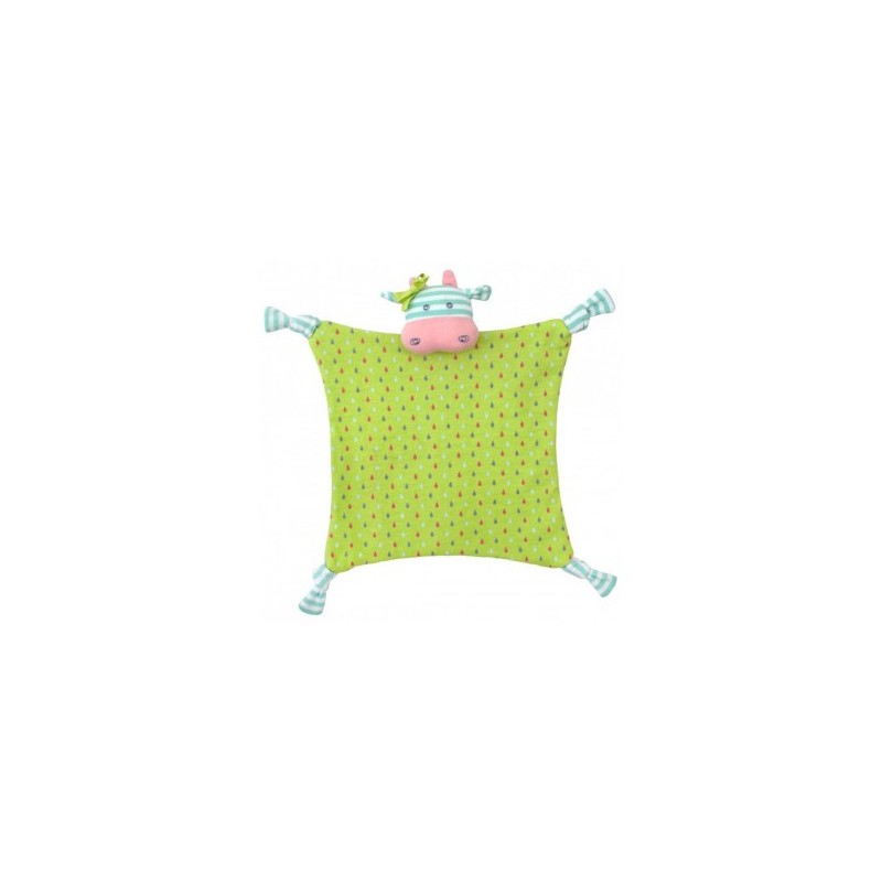 Doudou vaca Belle con nudos en los extremos para facilitar el agarre de las manitas del bebé. ¡Ideal para estimular el desarrollo sensorial y motriz!