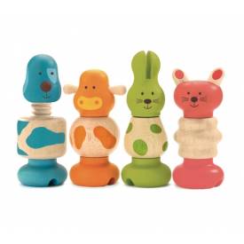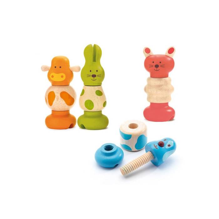 ¡Un juego de montaje para componer 4 animales de madera (pato, vaca, conejo y gato)! El niño elige un tornillo con la forma de la cabeza de un animal y busca el cuerpo y la base del mismo color para atornillarlo. Junta las piezas atornillándolas y luego juega con los animales.