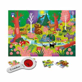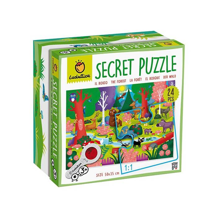Puzle con 24 piezas con temática de un bosque, con lupa de papel mágica para ver objetos escondidos, de Ludattica.