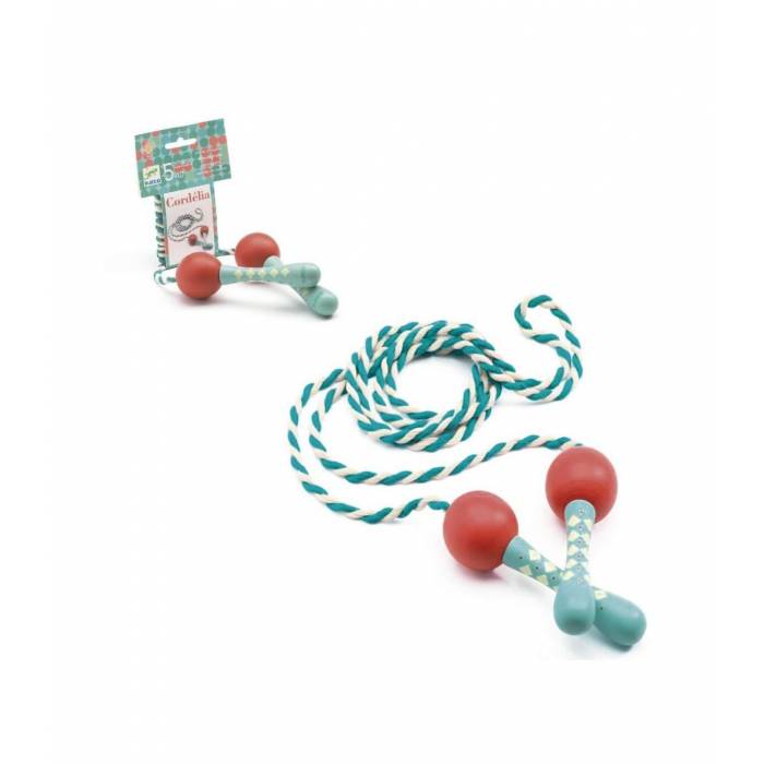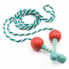 omba o cuerda de saltar con mangos de madera en color azul y rojo.