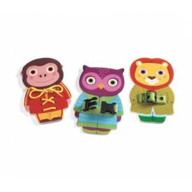 Juego de destreza manual compuesto por 3 animales de madera: mono, búho y león.