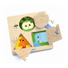 Una plancha de madera con cerraduras de metal en la que el niño se divierte abriendo y cerrando las puertas geométricas para descubrir los animales escondidos (un búho, una gallina y un elefante).