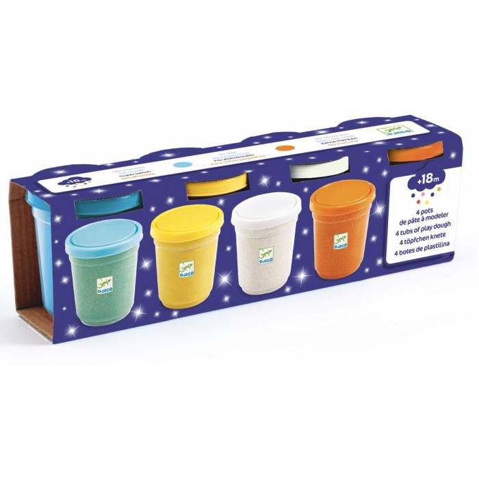 Contenido: 4 botes de pasta de modelar con purpurina (140 gr): 1 naranja, 1 azul claro, 1 amarillo y 1 blanco.