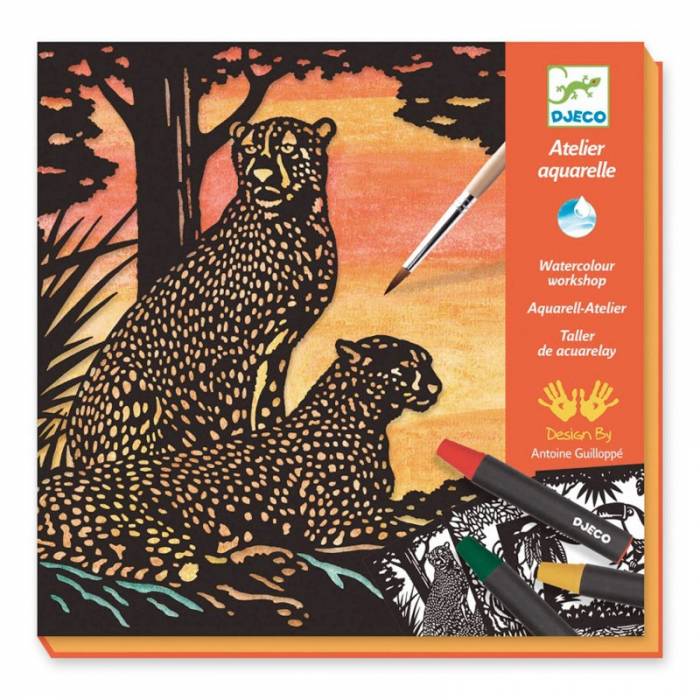 Con este set, los niños podrán completar las láminas con diseños de animales salvajes. Una vez listas, basta con doblar la portada y cerrarlas para que el negro contraste con los colores y conseguir un efecto a contraluz.