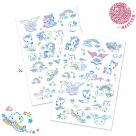 Set de 2 láminas con múltiples tatuajes de unicornios con detalles en purpurina, tan realistas que parecen dibujados a mano.