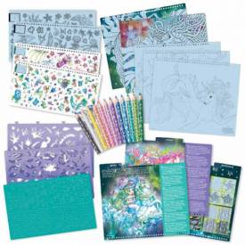 Incluye: 35 páginas de bocetos azules, 80 plantillas, más de 80 diseños de inspiración de plantillas, 4 patrones de frotamiento, 2 páginas de pegatinas de colores, 2 páginas de pegatinas para colorear, 12 lápices de colores, 12 técnicas de dibujo, 3 secciones diferentes, teoría e instrucciones del color