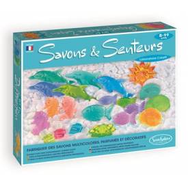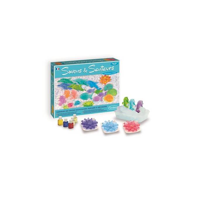 Kit para fabricar unos jabones bonitos y perfumados utilizando una base de glicerinada transparente, de SentoSphère. Es ideal para introducir a los más pequeños en el arte de crear jabones artesanalmente. La glicerina se derrite en 2 minutos en el microondas o al baño maría. Una vez que el jabón se encuentra en estado líquido, se pueden mezclar los diferentes perfumes y colorantes, antes de vaciar la solución en los moldes. El jabón se enfría en poco tiempo. Los niños disfrutaran no solo con el placer de crearlos, sino también con la decoración del baño y la alegría de usarlos a diario. Son productos adecuados para la delicada piel de los niños y los jabones terminados pueden usarse sin temor.