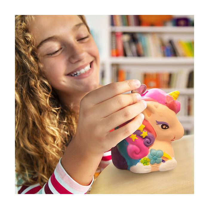 Pinta tu propia hucha de mini unicornio con purpurina. ¡Usa tu imaginación para crear tu propia caja de ahorros mítica de unicornio! Podrás decorarla con las pinturas que vienen en el pack. Este tipo de actividades creativas son muy relajantes. Les sumerge profundamente en su lado más creativo e imaginativo. Les ayuda a mejorar la atención, la paciencia y la concentración y, además, les permite trabajar el color, la geometría de las formas y la visión espacial. Potencian la concentración, mejoran su precisión y les ayudan a ser más pacientes.