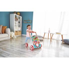 Este andador va a ser el compañero perfecto para los primeros pasos del pequeño. Es de madera y tiene velocidades ajustables que se adaptarán a su ritmo. Para mayor diversión, podrán jugar con los instrumentos y actividades incluidas: tocar el tambor, el xilófono o jugar con los tres bloques giratorios y el espejo.