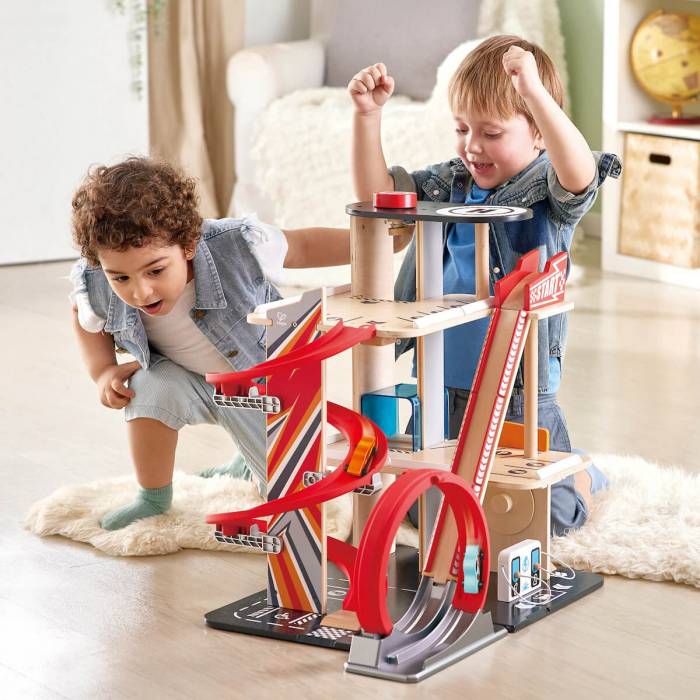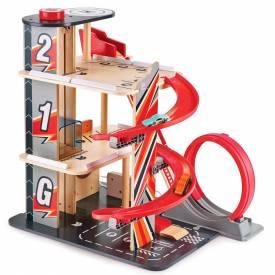 Este espectacular garaje de acrobacias y estacionamiento esta equipado con numerosas funciones que ofrecerá a tu peque horas de diversión con muchas posibilidades. Incluye 3 pisos para estacionamiento, una gasolinera en la planta baja y 2 pistas donde los coches de carreras pueden correr de arriba a abajo. Mueve los autos entre los pisos con el elevador giratorio operado por perilla, por la pista en espiral o la rampa empinada que termina en un bucle fantástico. El bucle anti-gravedad de 360° también se puede usar como una pista de salto separada. Los coches se pueden cargar de forma divertida en la estación de carga del centro de servicio. Este juguete además de ofrecer entretenimiento, ayudará a estimular la imaginación de tu pequeño piloto favoreciendo el desarrollo