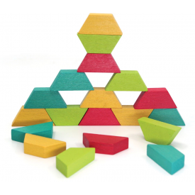 Piezas de madera en forma de trapecio para poner a prueba la creatividad y la resolución de problemas. Las piezas se encajan en los tableros. También se pueden usar para formar nuevas figuras.