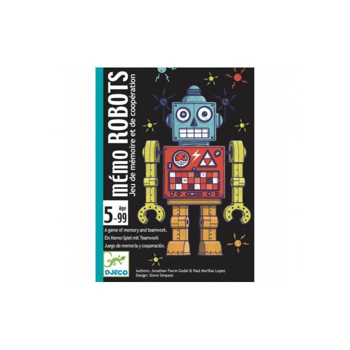 Memo Robots es un juego de memoria y cooperación, para jugar en solitario o acompañado. Harán falta memoria y cooperación para conseguir las cartas del robot «bueno». Al más mínimo error, el robot «malo» nos la jugará.