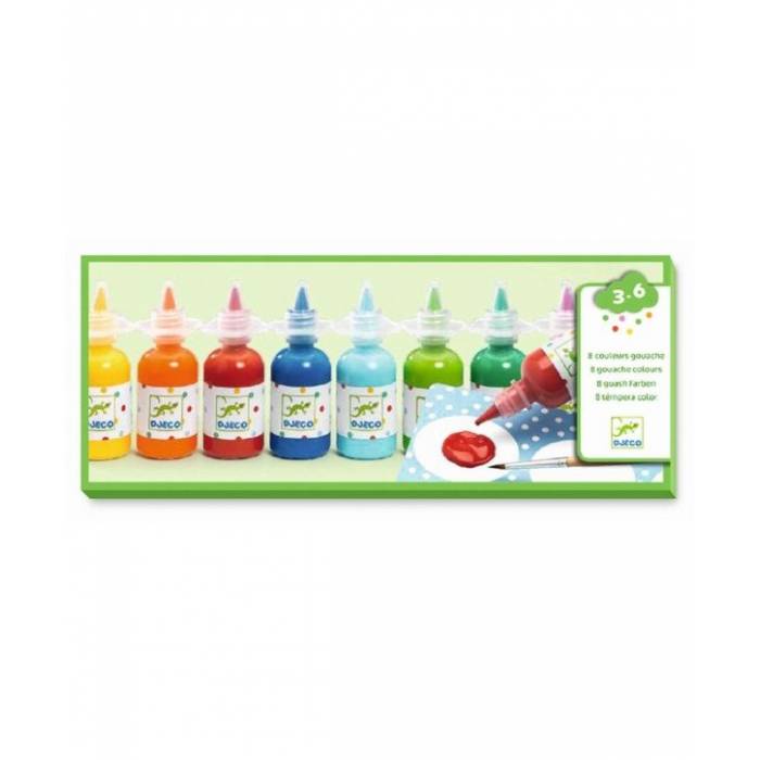 Caja con ocho colores diferentes de botes de témpera de 30 ml cada uno.