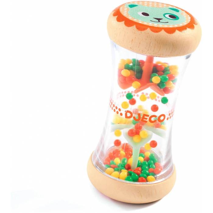 -Un pequeño palo de lluvia de madera natural en tonos intensos pensado para bebés de más de 3 meses. El bebé da la vuelta al palo y lo agita para ver cómo caen las bolitas y escuchar el suave sonido de la lluvia. -La transparencia permite observar el movimiento de las bolitas. -Fácil agarre. -El sonajero rueda. -Un primer juguete de estímulo sonoro.