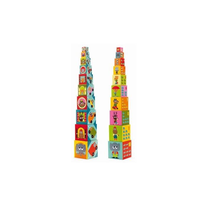 -Cubos encajables sobre el tema de los animales y los vehículos. ¡10 cubos de cartón grueso que se encajan, se apilan y se tiran sin parar! El niño apila los cubos de forma que las ilustraciones sigan una serie lógica.