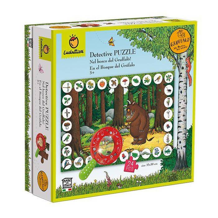 Adaptación de la colección Detective Puzzle para niños y niñas a partir de 3 años, con motivos del bosque del Grúfalo. Al terminar el puzzle, íla diversión continúa con un juego de detectives! Utiliza la lupa de madera especial para encontrar todos los objetos ocultos en este bosque.