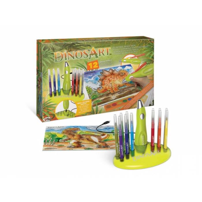 Un aerógrafo infantil con bolígrafos recargables. Tiene un uso muy sencillo para poder pintar, sólo hay que colocar el bolígrafo del color deseado sobre el aerógrafo y pulverizar sobre la superficie elegida. La pintura de acuarela se combina con el aire para colorear bien sobre las plantillas que incluye o sobre composiciones propias.