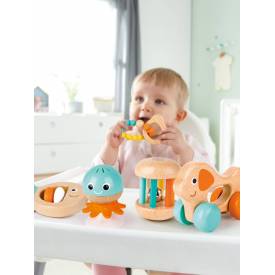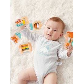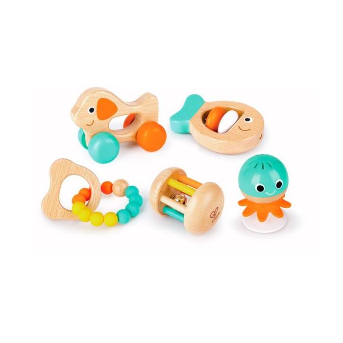 - Incluye un sonajero con forma de pez, un aro mordedor con formas de perlas, un sonajero ventosa, un sonajero con rueditas y un perro sobre ruedas. Es ideal para el desarrollo del oído a partir de los 3 meses.