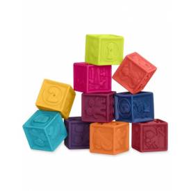 10 cubos muy blanditos con 60 relieves, 10 números (del 1 al 10) 10 formas (estrellas, corazones, barritas, la luna...) y multitud de animales.