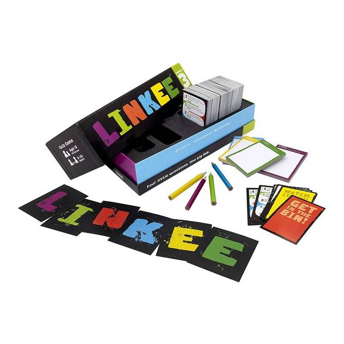 Calabaza, doce, zapatos y hermanastra... ¿Qué une a estas cuatro palabras? Linkee es un party game de preguntas muy premiado por su ingenioso mecanismo: hay que responder 4 preguntas diferentes, de cultura popular, y sus respuestas tendrán algo en común que hay que descubrir, ¡el Linkee!
