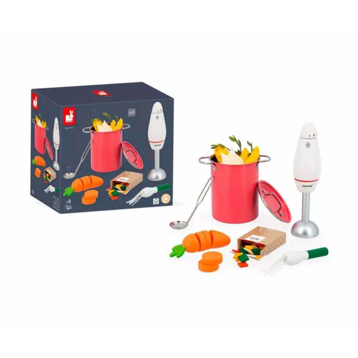 ¿Qué hay mejor que una buena sopa hecha por los niños? ¡Esta es una gran forma de concienciar a los más pequeños de la importancia de comer sano y consumir verduras de temporada! Con este set de sopa, el niño a partir de 3 años podrá inventarse sus propias recetas de potaje. Para ello tendrá hierbas aromáticas de fieltro, puerro, zanahoria, patatas y cebollas de madera. Además, si se anima a hacer una minestrone, puede añadir a su preparación la pasta multicolor (de verdura, por supuesto) del paquete incluido. ¡A cocinar se ha dicho! ¡Solo hay que dar rienda suelta a su imaginación y ponerse manos a la obra con la olla de metal con tapa, el cucharón y hasta una batidora para hacer crema o puré de verduras! Con todos estos accesorios tan realistas, este juego permitirá al peque inventarse ricos platos y hacer como los mayores disfrutando de un buen rato juntos en torno a una deliciosa comida. Los accesorios de madera de este juguete de cocina cuentan con el certificado FSC®.