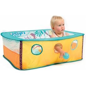 La bonita piscina de bolas con temática de la selva define un espacio para que los bebés jueguen con las 40 bolas de colores y sus juguetes favoritos y pasen las bolas y sus manitas por los 3 agujeros.