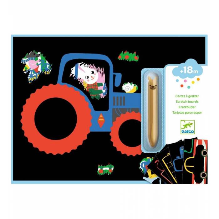 He aquí 5 fantásticos cuadros para rascar sobre los vehículos con usn gran punzón de madera apto para los más pequeños, a partir de los 18 meses. Con los dos extremos del punzón, el niño rasca la superficie de la tarjeta para trazar motivos o descubrir sorpresas, ¡qué agradable! Aunque se deje llevar y lo rasque todo, el resultado será igual de bonito.