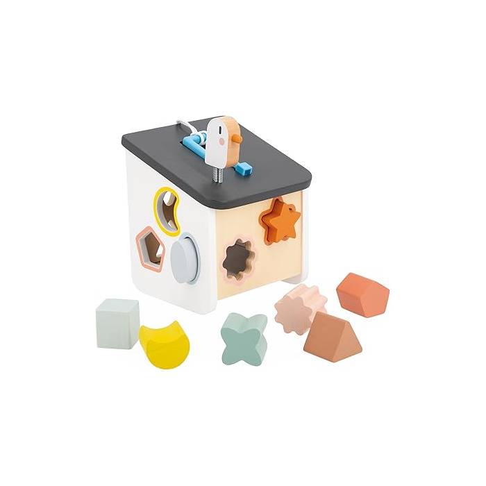 La caja de formas de madera con look de casita de pájaros es perfecta para bebés a partir de 18 meses. Encajar formas ayuda al pequeño a desarrollar destreza y reconocimiento de formas y colores. ¡Las 8 piezas grandes de madera son fáciles de agarrar y encajar! El contorno de las formas es del mismo color que las piezas para facilitar el juego. ???? Además, el gracioso pájaro en el tejado despierta la curiosidad del bebé y le invita a tocarlo. La caja tiene dos modos de recuperar las piezas: abriendo el techo o la puerta lateral con la llave incluida. ????️ El fieltro en el fondo de la casita amortigua el ruido de las piezas al caer, ¡y el diseño en madera natural es una delicia para los sentidos! ????