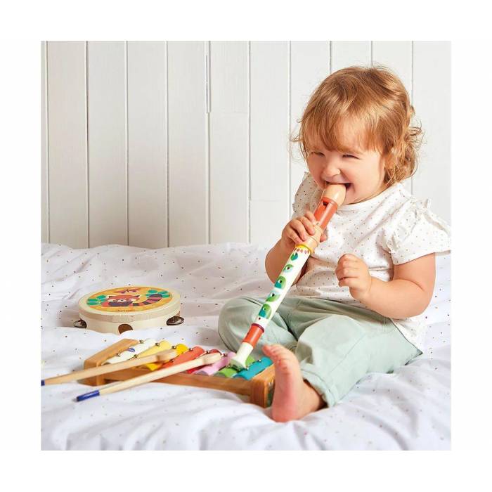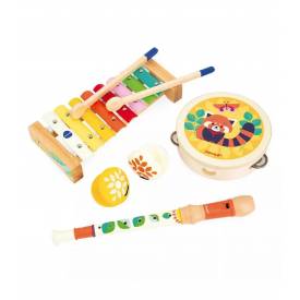 Este set incluye un xilófono de madera y metal de 8 tonos con 2 baquetas, una pandereta con bonitas ilustraciones, una flauta de madera de colores y 2 castañuelas alegres.
