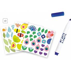 - CARACTERÍSTICAS: Este kit Janod contiene 3 cuadros que decorar, 3 hojas de pegatinas gruesas, 3 cuadros borrables reversibles (6 dibujos), 1 rotulador borrable y 1 folleto de instrucciones. Actividad manual para niños de 4 a 6 años.