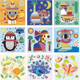 - DECORA Y COLOREA: Con este juego creativo, se pueden hacer 9 obras gracias a 2 técnicas distintas. Da volumen a 3 cuadros con pegatinas (unos 45 min. cada uno) y completa los 6 cuadros de grafismo con el rotulador borrable (1 h 30 min. cada uno).