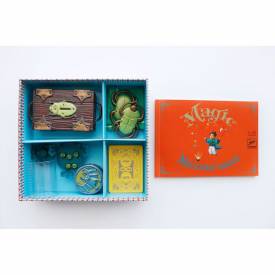 Incluye varios accesorios necesarios para los diferentes trucos de magia como cartas, pañuelo, cajita, cofre...