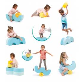 Juntos o por separado, ambos módulos pueden colocarse en distintas posiciones, ofreciendo múltiples posibilidades de juego abierto y evolutivo: los niños podrán caminar sobre ellos, escalar, subir, bajar, columpiarse, deslizarse, mantener el equilibrio, atravesar obstáculos...