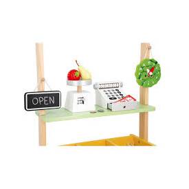 - Mercado de madera de la temática granja con 32 accesorios para jugar: frutas y verduras, cajas de comestibles, balanza, caja registradora, pizarrita de abierto/cerrado con tizas, reloj, bolsas de red y bolsas craft.