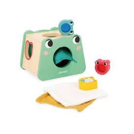 - En primer lugar, una caja de formas de madera con forma de rana con sus 3 bebés ranitas de colores: cada una de las formas encajables incluye una actividad sensorial diferente (efecto espejo y filtros de colores) y un color distinto para enseñar al pequeño a encajar formas. Para enriquecer aún más la experiencia sensorial, se incluyen además 3 telas de diferentes texturas. ¡Escóndelas en la caja de formas y deja que el bebé las agarre metiendo la mano dentro!