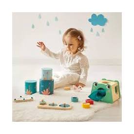- Por último, el niño disfrutará con un bonito puzle de madera: compuesto por 3 piezas que el bebé puede asir por los agarradores, le invita a descubrir a los habitantes del estanque que se esconden bajo los nenúfares de distintos tamaños.