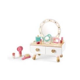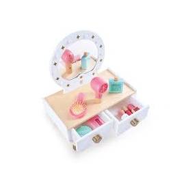 Tocador de madera con luces de color cálido. Incluye un secador de pelo con sonido, un peine amortiguador de aire, una barra de labios en color de moda, un frasco de esmalte de uñas, una sombra de ojos, un frasco de perfume, una brocha para colorete, un estuche de hojaldre.