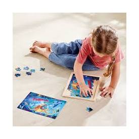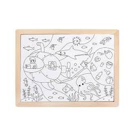 Sumérgete en aguas desconocidas con este puzle de 48 piezas. Verás cómo limpian el fondo del mar en un submarino y también un narval, un calamar gigante ¡e incluso un montón de jaleas rosas! También hay un dibujo en blanco por detrás para que puedas colorear tu propio puzle. Este puzle viene con una bandeja de madera y un póster de consulta.