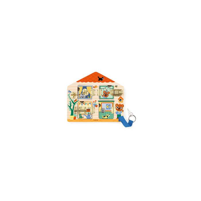 El tablero cuenta con diseño de casa con puertas y ventanas que se abren de diferentes formas.