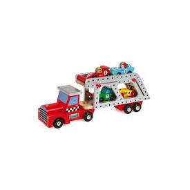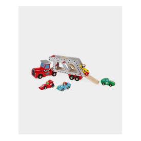 Un vehículo que transporta otros vehículos: siempre es impresionante para los pequeños ver este tipo de camiones en la carretera durante un viaje. ¡Este es uno más pequeño que hará las delicias de los fans de los coches y los bólidos de todo tipo! Con su rampa de fácil manejo, este camión de madera puede llevar dos coches de carreras en cada nivel, es decir, cuatro en total (1 Fórmula 1 rojo, 1 Speed azul, 1 Roadster verde y 1 Retromotor amarillo) que se pueden transportar en el camión o utilizar para jugar por separado. Para que la rampa se deslice hacia la parte trasera del camión y se abra la puerta, solo hay que tirar de las pequeñas asas rojas. ¡Este bonito camión hará las delicias de los amantes de los vehículos desbordantes de imaginación a partir de 2 años!