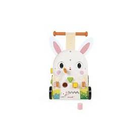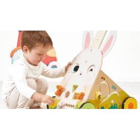 Este carrito multiactividades de madera es perfecto para niños a partir de 1 año, ¡con un montón de pequeños juegos en los 3 lados! Se trata de divertirse y desarrollar la motricidad fina y la destreza con las 9 divertidas actividades de nuestro travieso conejo: circuito en bucle con sus zanahorias, caja de formas tradicionales y ratoncito para deslizarse por un laberinto en la parte delantera, laberinto de abejas en un lado, engranajes y sol sonoro en el otro. Los grandes ojos de nuestro conejo giran y sus mejillas son de fieltro, al igual que sus orejas, para desarrollar el sentido del tacto del niño. Un detalle divertido: las orejas son extraíbles con cierres de velcro, ¡para que puedas cambiarlas de posición a tu gusto! Este simpático carrito de actividades es especialmente adecuado para aprender a andar. Gracias a su asa regulable en altura (de 46 a 53 cm), se adapta a la estatura del niño. Puede utilizarse desde los 12 meses hasta los 3 años. Para mayor seguridad, dispone de un freno en las ruedas fácilmente regulable en 3 posiciones (bloqueo total, velocidad reducida, velocidad normal), para que puedas soltarlas progresivamente y controlar la velocidad del carrito a medida que tu hijo aprende. Un carrito de madera con freno es ideal.