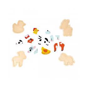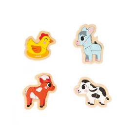 ¡A partir de 18 meses los niños pueden empezar a disfrutar de los puzles! ¡Son perfectos para desarrollar la motricidad fina y la coordinación! Con este lote de 4 puzzles evolutivos de primera infancia, ¡los pequeños fans de los animales de la granja estarán encantados! Este juego de puzles de madera, que viene en una bonita caja de regalo, consta de cuatro puzles que van de 2 a 5 piezas para que los niños se diviertan y progresen a su ritmo. Están los animales favoritos de los más pequeñitos: una gallina de 2 piezas, una vaca de 3 piezas, una cabra de 4 piezas y un burro de 5 piezas. Las piezas, que hay que posicionar en su sitio en un soporte de madera, son lo bastante grandes como para que el bebé pueda agarrarlas bien. ¡Disfrutará un montón jugando con este juguete de estímulo! Además, con este juguete también podrá empezar a aprender los números. Puzles de madera FSC®.