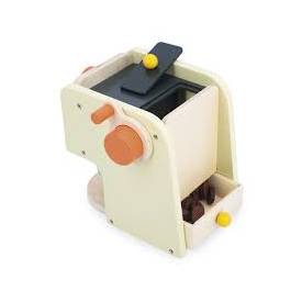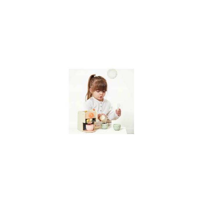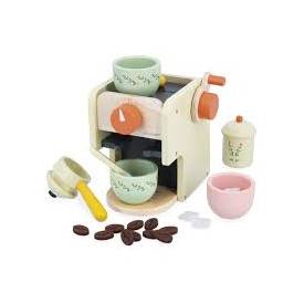 ¿Te apetece un café? Este set de imitación es adecuado para niños a partir de 3 años y consta de una cafetera y 5 accesorios de madera: ¡suficiente para convertirse en un auténtico barista! Este set de madera es perfecto para añadir a la cocina y al comedor de juego, y estimulará la imaginación de los niños a los que les encanta imitar a los mayores cuando preparan su propio café. Consta de : 2 tazas, 1 azucarero y terrones de azúcar, 1 cafetera con granos de café, 1 cuchara y, por supuesto, ¡1 cafetera! Abre la trampilla de la parte superior de la cafetera de juguete para introducir los granos de café que hay que moler. Gira la manivela de su lado: ¡es una calabaza! A continuación, recoge los posos de café en el cajoncito de la parte trasera de la cafetera y colócalos en el asa del filtro. Inserta la manivela en la cafetera y gírala un cuarto de vuelta para fijarla en su sitio. Sólo queda ajustar la duración del café o su temperatura con el mando giratorio de la parte frontal, ¡y el café estará listo! Verter el café y el azúcar, o manipular las distintas partes de la cafetera, estimula la motricidad de los niños. Pueden imitar las acciones de los adultos y ganar confianza en su vida cotidiana. Quién sabe, ¡puede que pronto sean capaces de servirle su propio café matutino!