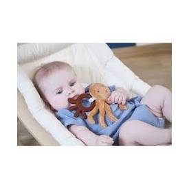 ¡Alivia el dolor de encías del bebé con este mordedor de silicona! ¿Es un pequeño extra? Un pequeño edredón de pulpo para facilitar el agarre y calmar al bebé. Útil y original regalo de nacimiento, este mordedor naranja tiene ranuras y pequeñas protuberancias para aliviar la dentición. Para mayor tranquilidad y comodidad cuando al bebé le están saliendo los dientes, ¡el pulpo de peluche extrasuave se puede abrazar y llevarse a la boca una y otra vez! Es bimaterial (microterciopelo y pelo sintético), acolchado con poliéster reciclado y mide 17 cm de alto. La nuca está decorada con un estampado "Wave Dance" y un bordado de peces que estimulará el tacto del bebé. Bajo el signo de la relajación, los fondos marinos son sinónimo de bienestar y calma. Puedes lavar el aro y su peluche en la máquina a 30° para un fácil mantenimiento. Este mordedor de pulpo pertenece a nuestra colección Petit Calme, la gama diseñada para tranquilizar y reconfortar al bebé y para ayudar a los padres preocupados por la comodidad de su pequeño.