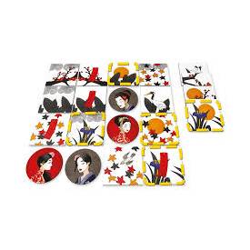 8 fichas de Geisha para el jugador rojo, 8 fichas de Geisha para el jugador negro, 16 losetas de jardín imperial.